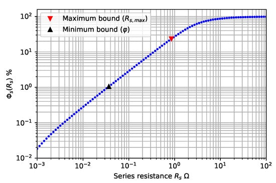 In order to calculate boundaries for , geometric limitations are incorporated as photovoltaic power restrictions. The upper limit of is calculated by using the slope of the line that connects the maximum power point and the open circuit voltage , as indicated in Equation (27). On the other hand, the minimum value of corresponds to zero; however, it is useful to set an infimum value for series resistance as different from zero. For this purpose, a detailed study on the variation of the maximum power point in function of the series resistance is performed; nevertheless, the variation of the maximum power point is presented as the deviation of the ideal case as indicated in Equation (28). Here, the maximum power is calculated using the ideal photovoltaic model considering a series resistance values different from zero.