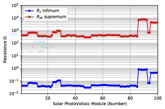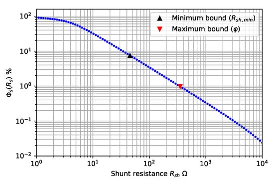 A similar calculation method to the one presented for series resistance can be applied to determine the shunt resistance. Since a minimum value of the shunt resistance is known, a finite maximum value needs to be defined. Then, a supremum value for the shunt resistance is calculated. In this case, Equation (31) presents the minimum value of calculated using the short-circuit current and the maximum power point . To calculate , the variation of the maximum power point is studied as indicated in Equation (32). Here, the maximum power is calculated using the ideal photovoltaic model, considering a shunt resistance different from zero.