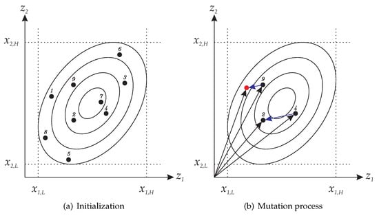 The mutation process creates a mutant vector that is used to modify . This vector is defined as follows: three different elements belonging to are randomly selected: , , and . Then, is calculated subtracting the difference between vectors and . This difference is then weighted by a mutant factor F and added to vector , as indicated in Equation (40). Note that F corresponds to a single number that lies in the range of . Considering that is calculated from vectors of dimension D, it must also be composed of D elements , as indicated by Equation (41). This calculus methodology is illustrated in Figure 8b, where , , and , are represented by vectors (9), (2), and (4). In this example, the mutant vector begins in the origin of the reference system and ends in the red dot.