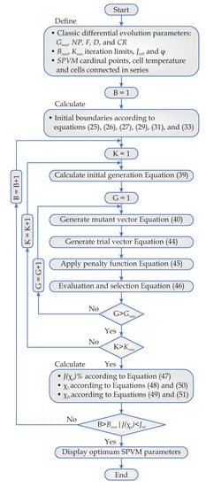 This procedure must then be repeated B times until the solution reaches the required tolerance , set by a user-defined threshold, or if the algorithm meets the maximum number of iterations . The performance of the solution is determined as indicated in Equation (47). Figure 9 indicates the proposed DEA flowchart.