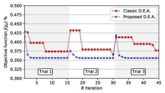 The performance of the adaptive limit module is studied by comparing the DEA % value on three trials. For this purpose, the SDM is used to execute the optimization, assuming equal to 1%. The initial limits for the proposed value are indicated in Table 1. It can be seen from Figure 10 that the error of the classical DEA algorithm decreases stochastically as improved solutions are found within the initial boundaries specified. On the other hand, the solution found by the proposed DEA algorithm improves in each B iteration, until the fifth iteration. This is explained by the fact that in the fifth iteration, the values of the upper and lower limits are similar; therefore, the algorithm has converged to a final value. Table 2 indicates the best SDM solution achieved for both the classic and proposed DEA. It can be seen that the error of the solution found by the proposed algorithm is approximately 2.58% better than the result obtained by the classic method. However, this does not mean that the classic algorithm cannot reach the same solution, as this value is contained within the search range of the classic DEA.