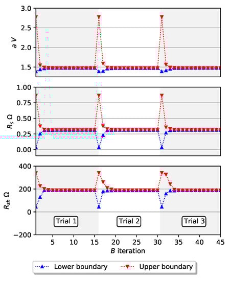 This section proposes a methodology for the calculation of the boundaries on which the SDM parameters reside. However, it is only able to determine the boundaries for the following variables: (i) the equivalent thermal voltage, (ii) the series resistance, and (iii) the shunt resistance, since the remain parameters can be calculated according to Equations (23) and (24) [].