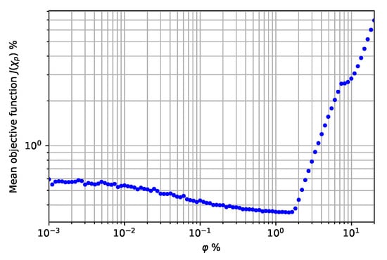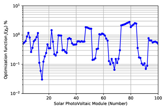 Figure 12 shows the evolution of the objective function, where each point in the figure represents the mean value of 100 executions of the proposed DEA. It can be seen from this figure that as increases from , the value of decreases until it reaches a minimum value which resides in the range of [1%, 2%]. From this minimum value, as continues to increase, the objective function starts to increase. This performance degradation is caused by the fact that the value of the upper and lower limits of the series and shunt resistances have similar values; therefore, the DEA can only modify the equivalent thermal voltage in order to find the optimal solution.