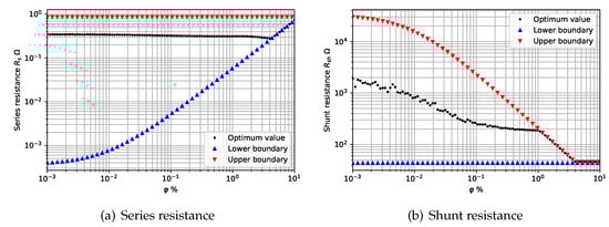Figure 13a,b indicate the evolution of the optimal series and shunt resistances as well as their boundaries. In the same manner to the results presented in Figure 12, the algorithm is executed 100 times, obtaining the mean value of the DEA. It can be seen that for a given critical value, the optimal resistances equals its upper (or lower) boundary. This fact suggest that must be lower than the critical value. For the KC200GT SPVM, a critical value near is achieved. This work assumes an appropriate value of 1%, as a wide range of solutions can be obtained from this value.