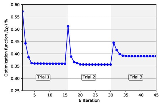 The evolution of the boundaries of a, , and can be seen in Figure 11. This figure indicates that the final value of the optimized variables is very similar for each trial. These results suggest that the proposed DEA is capable of delivering a single high performance solution in few iterations every time it is executed. Therefore, the adaptive boundary module will be considered in every B iteration. Additionally, the algorithm is run three times selecting the best solution.
