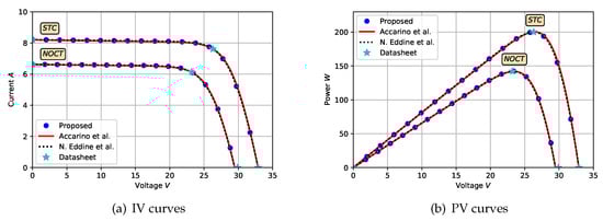 This sub-section is divided as follows: (i) comparison of the electrical parameters obtained for the Kyocera KC200GT SPVM, and (ii) comparison of the cardinal points estimated using the database added in Appendix A. The cardinal points considered as input data correspond to (i) STC (reference condition), and (ii) NOCT (operating condition), both available in the datasheet of each module.