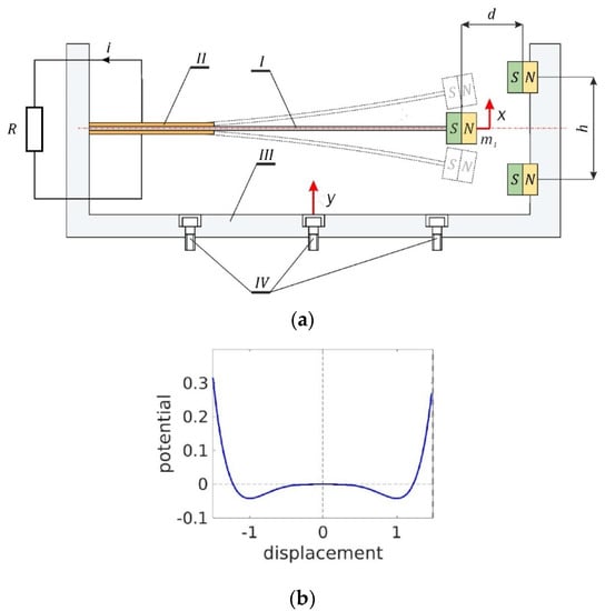 The system for energy harvesting from vibrating mechanical sources is presented in Figure 1a. The system consists of a mechanical resonator with a cantilever beam, a piezoelectric transducer, and an electrical circuit. As a result of the piezoelectric deformation caused by the inertial force, the electromotive force is created inside the electrodes. It is worth noting that the electrodes are placed along the piezoelectric patches. Consequently, the electrical charge is moving through the electrical circuit, resulting in the voltage and power outputs on the load resistor. The special configuration of permanent magnets models the shape of the potential, forming a quasi-zero stiffness of the cantilever and restoring force characteristics with additional symmetric potential wells in the specific bent positions of the cantilever (Figure 1b).