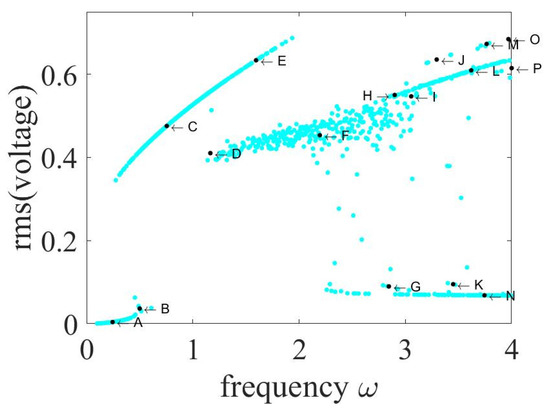 Evidently, cases H and L and, separately, cases J and M, lie along the corresponding branches for sub-harmonic (period two and period three solutions, respectively) larger orbit solutions (see Figure 2). The branch family of period three (with cases H and L) is completed by case 0 represented by nine Poincaré points per three loops in the phase portrait. Case N is the simple, small orbit harmonic non-resonant solution, while case P is represented by nine Poincaré points per three loops. The case P solution differs from the case J and M solutions by the attractor represented by the specific distribution of the Poincaré points, and the voltage output is visible in Figure 2 (see an additional branch). Classification of the analyzed cases A–P is gathered in Table 1.