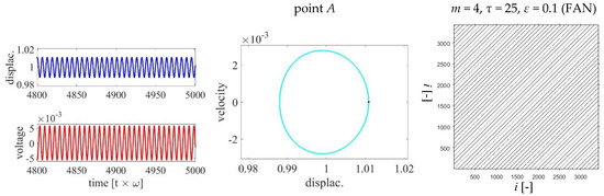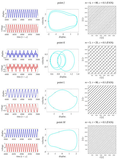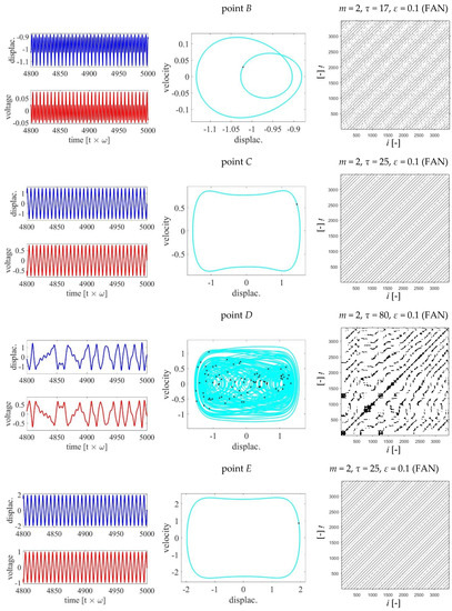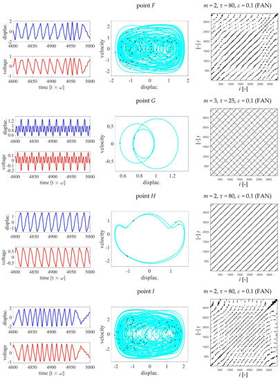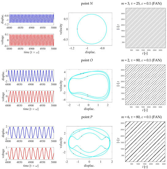 The detailed analysis results (points A–P) of the cases are marked in Figure 2. In the left, center, and right panels, time series (displacement and voltage outputs), phase portrait with Poincaré points, and corresponding voltage RPs are presented. FAN in the recurrence plots indicates the fixed amount of nearest neighbors [22], which is the method of calibration of RPs with the same recurrence density.