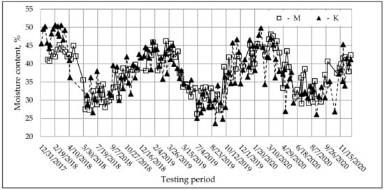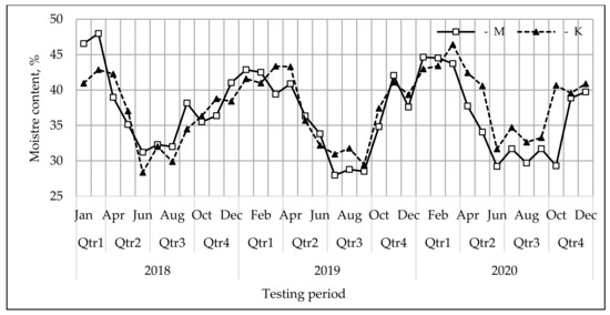 Experimental measurements of the total moisture of the chip samples provided from the heat supply companies M and K revealed that the change of this parameter correlates very well with annual seasonal changes in regional climate indicators. As is seen in Figure 2, in the summer from May to September, the minimum moisture content of the wood chips reached (30 ± 5)%. Maximum wood chip moisture up to (45 ± 5)% was observed in the period from December to April. Although only 3 years were analyzed, it can be said that the range of variation in the moisture content of the supplied wood chips varied slightly, as well as the annual changes in environmental conditions. Short-term changes in air humidity or precipitation did not change the basic pattern of wood chip moisture variation. These factors, together with the shortcomings of the express method used for moisture measurement, determined the deviations of the moisture data from the basic pattern curve and data dispersion.