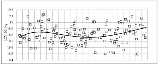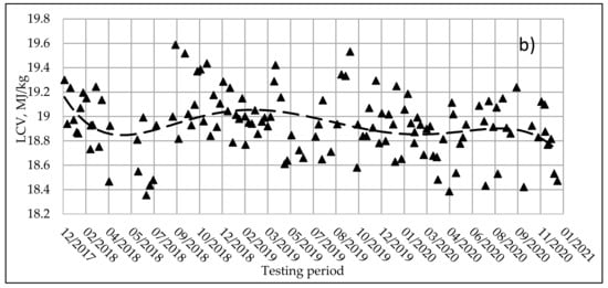 Daily average lower calorific values (LCV) and mean trendlines curves: (a) company M; (b) company K.