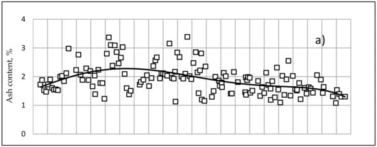 When wood chips with low impurities are used as fuel, their calorific value and ash content depend little on the type of wood used to produce chips in central and northern Europe [8,16,20]. However, as the practice of chip preparation in Latvia [6] showed, when storing green cutting waste in piles from half a month to 4 years and producing chips in February–May 2012, their relative moisture, calorific value, and ash content varied within the respective range (20.6–73.1)%, (15.7–19.7) MJ/kg, and (1.5–23.3)%. It is a consequence of the long storage of the raw material in piles under field conditions that determines the wider limits of variation in ash content and moisture content of the raw material.