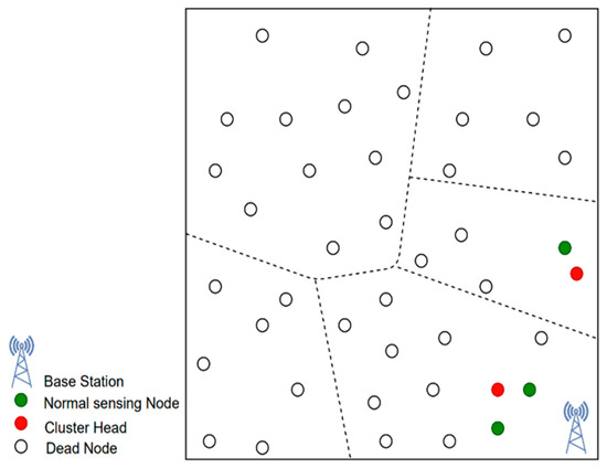 Figure 1 shows a typical hierarchical architecture, where sensing nodes collect the data from the environment and forward it to a leader node in the cluster, referred to as a cluster head (CH), which, after aggregation, further forwards it towards the base station. The analysis of data for decision-making purposes is generally performed at the BS level, but some basic computations can also be performed at the CH level or even at the normal sensing node level depending on the approach used [1,4].