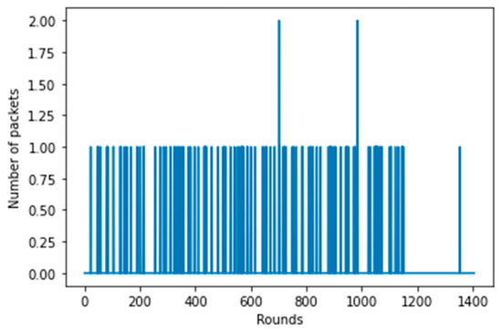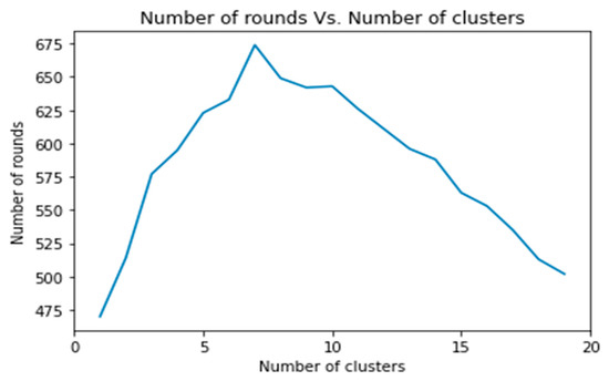 Based on the distance from the BS and the initial energy known, the lifetime of the nodes closer to the BS and the farthest nodes in terms of number of rounds can be calculated. Furthermore, in accordance with Lemma 2, the ratio of high energy nodes to be deployed as the distance from the BS increases has been determined, and the results are presented in Figure 18, which presents data from distant clusters for the majority of the network lifetime.