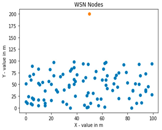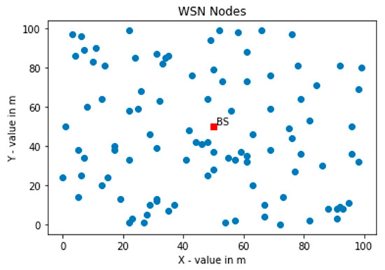 Random deployment of 100 sensor nodes in an area of 100 m × 100 m with BS positioned outside the deployment area at position (50, 200).