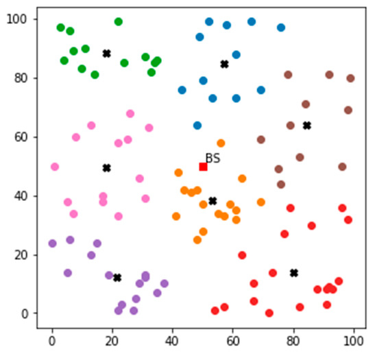 In Scenario 1, the deployment area (x, y) is 100 m × 100 m, and 100 nodes are deployed at random, with the base station at the centre (50, 50), as shown in Figure 6. Using k-means clustering, the randomly deployed nodes are grouped into an optimal number of clusters, and the centroid of each cluster (marked as ‘x’) is chosen, as shown in Figure 7 and Figure 8.