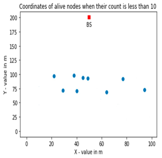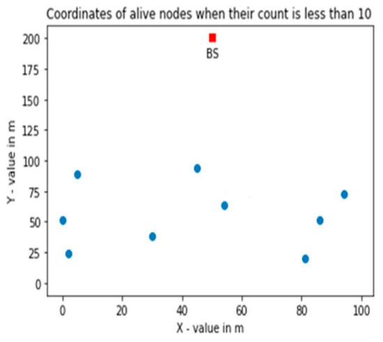 Placement of alive nodes when the count is less than 10 with uniform distribution of high energy nodes.