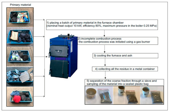 The second stage involved combusting the material collected. Each of the primary materials yielded a portion of ash from which the study material was selected. The crucial aspect was to maintain similar combustion conditions and clean the furnace chamber before burning each portion of fuel. The primary materials were incinerated in a Keller 10 kW coal burning furnace (with a nominal heating capacity of 10 kW, efficiency of 80%, and maximum working pressure of 0.25 MPa). According to the manufacturer’s specifications, the basic fuel for this type of boiler is hard coal of the pea and nut type, and the substitute fuel is lignite and weathered wood.