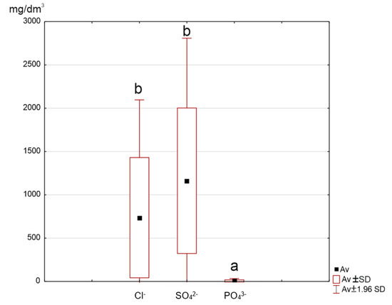 Boxplot for anions in ashes. Means marked with the same letter do not differ at p = 0.05.