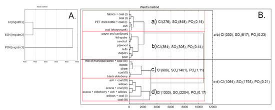 The analysis of correlations between individual cases, namely the 23 ash samples, allowed for distinguishing four (a–d) clusters (Figure 3B). Cluster (a) included ashes from the combustion of coal I and mixes including this type of coal (textiles, PET bottles), ashes from coal pellets, and ash wood. The average concentrations of Cl−, SO42−, and PO43− for this cluster of samples were (Me, in mg/dm3) 276, 848, and 0.15, respectively. In the case of chlorides and phosphates, these were the lowest values out of all Me calculated for individual clusters. Coal I was coarse and had a low content of chlorides and phosphates. Cluster (b) generally comprised ashes from alternative fuels (sawdust, walnuts, peat) and municipal waste (paper and cardboard, plastic-coated paper cartons, plywood, diapers). The average concentrations of chlorides and phosphates were slightly higher than in the previous cluster, and they amounted to (Me, in mg/dm3): 354 and 0.44, respectively. However, the Me for sulphates was the lowest out of all four clusters—305 mg/dm3. The third cluster (c) included ashes from various primary materials: wood (acacia, black elder), alternative fuels (straw), coals (coal II), and the mix of municipal waste and coal III. This cluster displayed the highest average for phosphates (Me = 1.11 mg/dm3) and high average values for chlorides (Me = 986 mg/dm3) and sulphates (Me = 1401 mg/dm3). The last, fourth cluster (d) generally comprised ashes generated after combusting mixes of wood (separately or together: ash, willow, acacia) and coals (coal III and coal II). In this cluster, the average leaching of chlorides and sulphates was the highest (in mg/dm3): 1333 and 2204, respectively. Leaching of phosphates was also high—0.17.