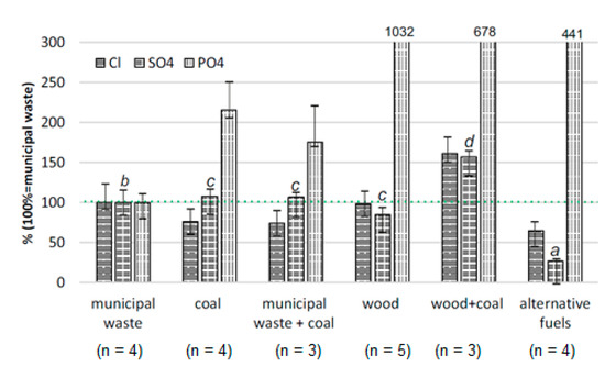 To verify the above hypothesis, the concentrations of the anions in individual groups of all the ashes studied were compared with the average concentrations of the three anions in ashes generated after combusting municipal waste (adopting these values as 100%). As a result, it was concluded that the addition of municipal waste to the process of burning fuels in household furnaces did not significantly affect the increase in chloride, sulphate, and phosphate content in ashes (Figure 4).