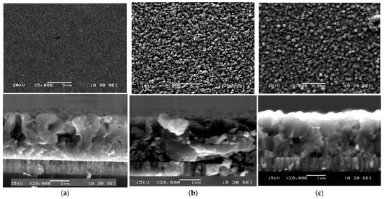 The thickness of each film was measured using a thickness profilometer (DektakXT Profilometer, Bruker, Tucson, AZ, USA). The films composition was measured by X-ray fluorescence (XRF) (Solar Metrology, Saugerties, NY, USA, System SMX). Surface and cross-section morphological analyses were performed by scanning electron microscopy (SEM) (JEOL JSM-6060LV). The crystallographic structure analysis was done by symmetric θ-2θ X-ray diffraction (XRD) (Miniflex II Benchtop Diffractometer, Rigaku, Tokyo, Japan). The elemental composition profile of the films was measured by dynamic secondary ion mass spectrometry (SIMS) using an ION-TOF SIMS V instrument.