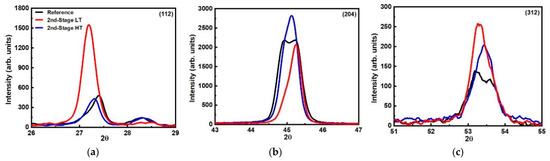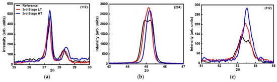 XRD plots ((a): (112) peak, (b): (204) peak and (c): (312) peak) for the reference (black), second stage LT (red) and second stage HT (blue) CIGS samples recrystallized in a CuCl2 environment.
