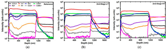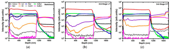 Secondary Ions Mass Spectroscopy (SIMS) depth profile (positive ions) of the main elements for the reference (a), third stage LT (b) and third stage HT (c) CuCl2 annealed CIGS samples.