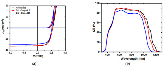 Representative (a): J-V curve and (b): QE curve for reference (black), third stage LT (red) and third stage HT (blue) devices.