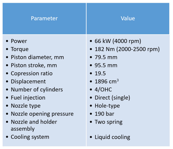 The main parameters of the test engine (1.9 TDI type: 1Z).