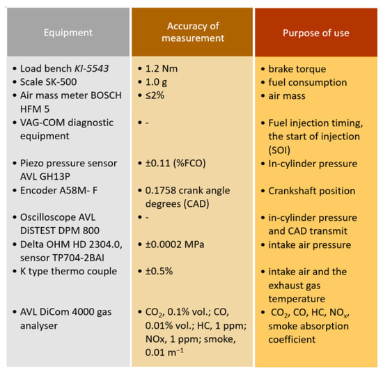 Tests were conducted using the 1.9 TDI diesel engine (type 1Z) equipped with an electronic control unit BOSCH VP37. Test engine had a rotary fuel pump and a turbocharger. Selected technical data of the 1.9 TDI engine are shown in Figure 1.