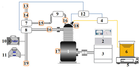Engine test equipment. 1–engine, 2–measurement output gauges, 3–engine load unit, 4–high pressure pump, 5–scales, 6–fuel tank, 7–compressor, 8–turbocharger, 9–intercooler, 10–exhaust gas analyser, 11–smoke analyser, 12–electronic control unit, 13–air mass meter, 14–intake air temperature sensor, 15–pressure sensor, 16–temperature sensor, 17–crankshaft position sensor, 18–in-cylinder pressure sensor, 19–exhaust pipe.