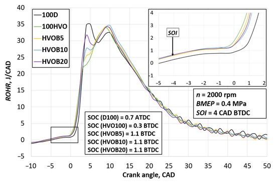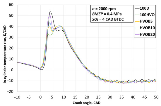 The maximum temperature rise value can be achieved with conventional diesel ~53° K/CAD, at 4 CAD ATDC) (Figure 5). When using HVO100, the maximum temperature rise decreased by ~22% at 8 CAD ATDC compared with conventional diesel. Additionally, HVOB5 dropped by ~24% 8 CAD ATDC, HVOB10 by ~19% at 4 CAD ATDC, and HVOB20 by ~4% at 4 CAD ATDC. With increasing biobutanol concentration in HVO, a difference in the temperature rise in the premix combustion phase was observed to decrease compared with conventional diesel and came close to the value of the reference fuel. These trends are in line with previously published works by the authors [12,62].