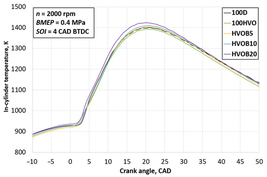 The assessment of the in-cylinder temperature graph (Figure 6) revealed that when increasing biobutanol concentration in HVO, the in-cylinder temperature in the controlled combustion phase also increased. The highest temperature of HVO100 was 1392 K, D100–1400 K, and HVOB20–1424 K. With increasing biobutanol concentration in HVO, the combustion process was also longer. This is why the temperature and the pressure of turbo-compressor increased during compression, emitting more energy along with exhaust gases, but resulting in better soot combustion.