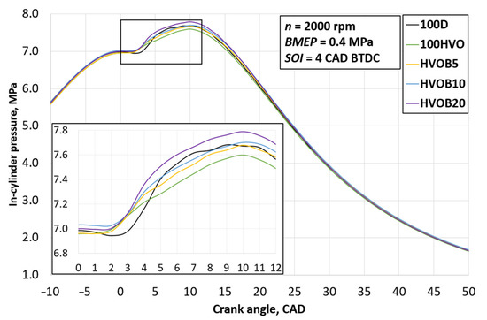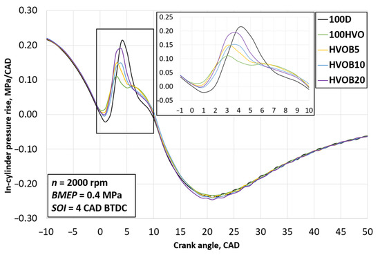 The highest in-cylinder pressure rise in the premix combustion phase was reached when using pure diesel: ~0.21 MPa/CAD, (Figure 7). The pressure rise of HVO100 in the premix combustion phase declined by ~48%, with HVOB5 decreasing by ~30%, HVOB10 by ~30%, and HVOB20 by ~11%. The greatest in-cylinder pressure rise was reached with D100, HVOB10, and HVOB20 fuel blends at 4 CAD ATDC, with HVO100 and HVOB5 fuel blend at 3 CAD ATDC. When increasing biobutanol concentration in HVO, the pressure rise also increased, but the result was not higher than that of conventional diesel.