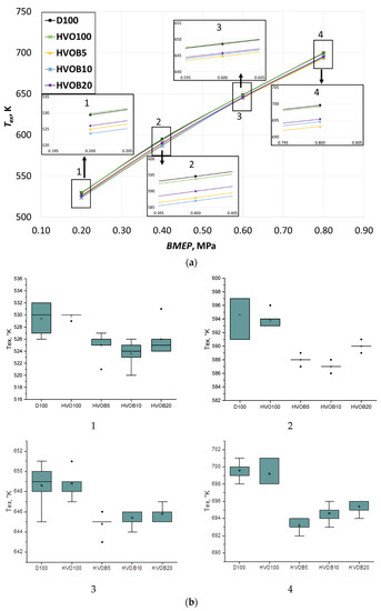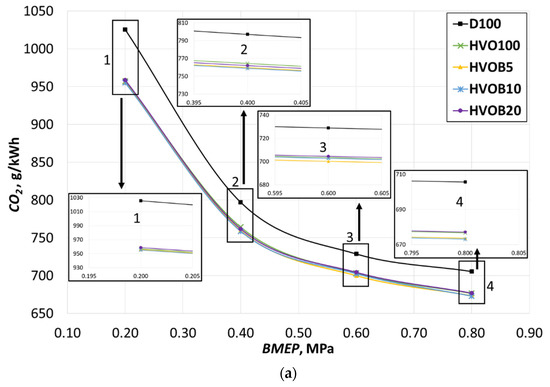 Figure 9 presents the dependence of the temperature of emissions on the engine load measured in the experimental research. The temperature of emissions of D100 and HVO100 fuels was observed to be almost the same at changing engine loads (BMEP = 0.2 MPa; 0.4 MPa, 0.6 MPa, and 0.8 MPa). Increasing the biobutanol concentration in HVO from 5% to 20% decreased the temperature of exhaust emissions in the range of 0.5% to 1.5%. Exhaust temperature depends on LHV value—with decreasing LHV, exhaust temperature also decreases (to supply the same amount of fuel in the cylinders per cycle) [61]. Having added biobutanol to HVO in the research, the value of LHV decreased compared with HVO100 (Table 1 and Table 2); however, more fuel was supplied (Figure 11) because the engine generated equal power. Having performed similar fuel tests, Yilmaz et al. concluded that blends of biodiesel and n-butanol rendered lower exhaust gas temperatures because of lower density of n-butanol and cetane number compared with diesel or biodiesel. Moreover, n-butanol mixed into fuel blends increases the oxygen content of the fuel, which improves and speeds up the combustion process, which lowers the exhaust gas temperature [63]. This is confirmed by ROHR (Figure 4), which shows that by increasing the concentration of biobutanol in the mixture, energy is released more intensively during the premixed combustion phase and that the amount of energy released decreases during the controlled combustion phase and later controlled combustion phase.