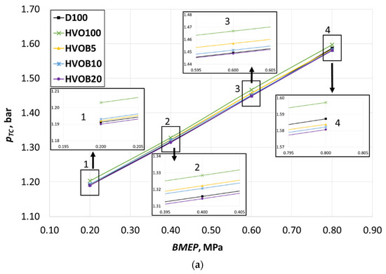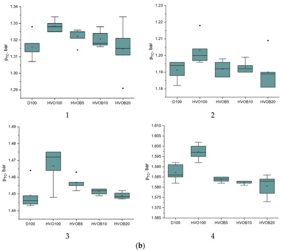 Figure 10 illustrates the dependence of the turbocharger pressure on engine load. Turbocharger pressure of D100 and HVO blends with biobutanol (HVOB5, HVOB10, and HVOB20) increased or decreased by no more than 0.5% at the designated engine loads. When using HVO fuel, this indicator increased and was about 1% higher in all engine modes compared with D100. The trend of a change in the turbocharger pressure was found to be similar to that of BTE of the engine (Figure 13), while values of brake thermal efficiency of HVOB5, HVOB10, and HVOB20 were determined to be similar to those of D100. The value of brake thermal efficiency of HVO100 was about 0.5% higher compared with conventional diesel. Energy efficiency of the engine running on HVOB5, HVOB10, and HVOB20 blends and the amount of energy emitted to the exhaust and cooling system was similar to that of D100.