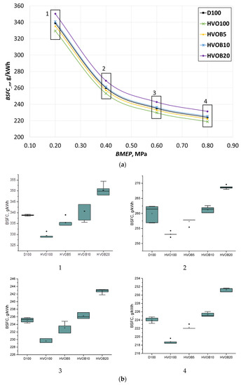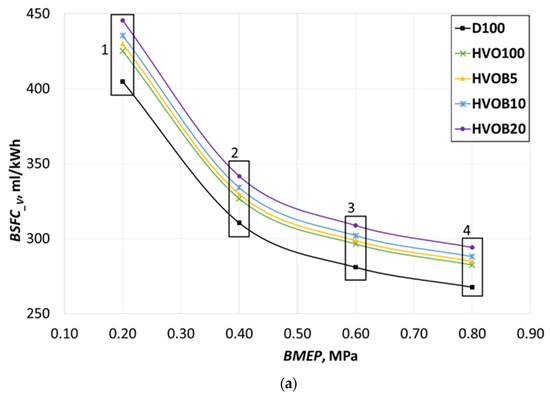Dependence of brake specific fuel volume consumption (BSFC_V) and the engine load is presented in Figure 12. The results presented in this figure look absolutely different compared with Figure 11; however, the assessment of LHV in terms of volume (MJ/l), which are presented in Table 1 and Table 2, revealed that these values (MJ/l) have tended to decrease: HVO100 about 5%, HVOB5 6%, HVOB10 7%, and HVOB20 9% lower compared with conventional diesel. Figure 12 illustrates this trend. Decreasing LHV value (MJ/l) in fuels or their blends leads to increasing brake specific fuel volume consumption. The greatest difference in BSFC_V was observed using HVOB20, where an increase was consistent at different engine loads: 9% compared with D100.