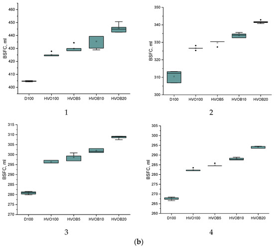- Regarding brake specific fuel mass consumption on fuel composition (BSFC_m) and the engine load, at different engine loads, the HVO100′s relative fuel mass consumption by mass is less than 2.3–2.8% compared with D100, and the value of the fuel mixture HVOB5 BSFC by mass is less than 0.8–1% compared with D100. However, the density of HVO100 is 7.5% lower compared with conventional diesel, but the lower heating value (LHV) is 2.3% higher than that of D100, and when evaluating the HVOB5 fuel mixture, the density is 7.0% lower, and the lower heating value (LHV) is 1% higher compared with the D100. The higher LHV value results in lower BSFC by mass values. Additionally, with increasing biobutanol concentration in HVO fuel (from 10% to 20%), BSFC by mass starts to increase: HVOB10 by 0.5–0.6% and HVOB20 by 3.2–3.4% increase compared with D100. The density of HVOB10 is 6.5% lower compared with conventional diesel, and the lower heating value (LHV) is 0.3% lower than D100; the density of HVOB20 fuel mixture is 6.0% lower, and the LHV value is 2.8% lower compared with D100. Estimation of brake specific consumption by volume gave different results, but there is a dependence on LHV by volume (MJ/l). As the value of LHV by volume (MJ/l) decreased in fuels and their mixtures, the brake specific fuel volume consumption increased: HVO100 about 5%, HVOB5 6%, HVOB10 7%, HVOB20 9% less compared with D100.