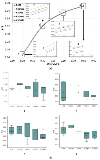 A decrease in LHV of fuel blends can be explained by the fact that the addition of n-butanol allows reducing fuel viscosity, improving injection and providing more oxygen in the combustion cylinder to improve chemical energy of fuel by turning it into useful engine work [66]. Studies conducted by other researchers rendered different results. Pan et al. used blends of biodiesel and 2-butanol in a CI engine in their research and discovered that BTE decreased at low engine loads but increased by about 7.08% at high engine loads [57].