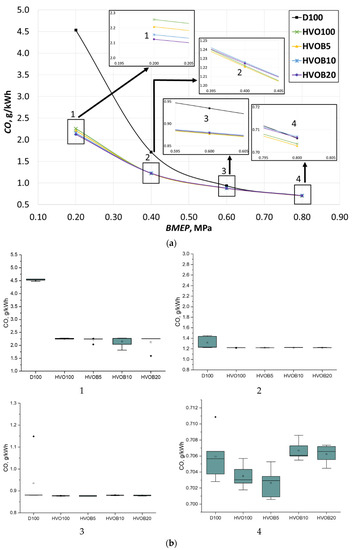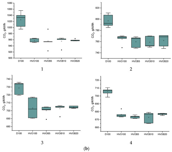 One of the key environmental indicators found during the research was carbon dioxide (CO2) content in the exhaust gas. Carbon dioxide is an environmental parameter emitted in complete combustion process when oxygen for a complete combustion process is enough. CO2 content can also increase with increasing content of carbon in fuel molecules [67]. The substitution of conventional diesel by HVO100 reduces CO2 emissions by 3.5–6.7% (Figure 14). The use of HVO and biobutanol fuel blends (with biobutanol concentration of 5–20%) did not result in any material changes in CO2 emissions; CO2 values of fuel blends were close to HVO100: 3.3–6.8%. The assessment of the obtained CO2 research results allows stating that biobutanol additive of up to 20% by volume in HVO does not have any significant impact on CO2 emissions.