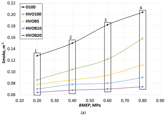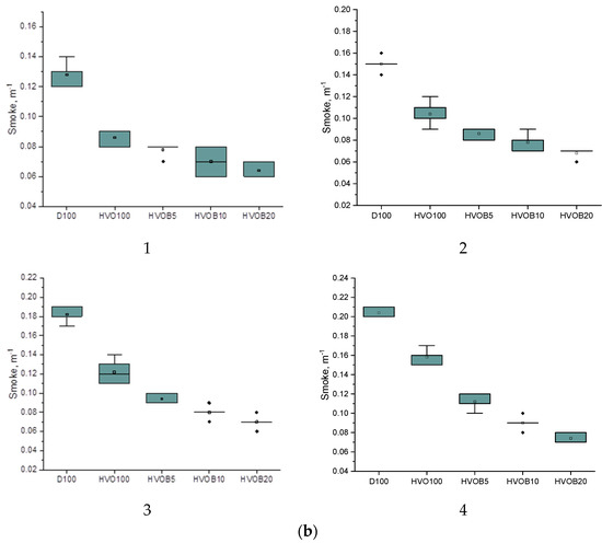 The use of HVO100 and blends of HVO and biobutanol led to a gradual decrease in smoke (Figure 16). The obtained research results revealed that HVO100 smoke value was 22–33% lower compared with D100, while smoke values of HVO and biobutanol blends had a tendency to decrease: HVOB5 from 39% to 45%, HVOB10 from 45% to 55%, and HVOB20 from 50% to 64%, compared with conventional diesel. Researchers Imdadulas and others used n-butanol and biodiesel mixtures at different proportions and observed a decrease in smoke compared with conventional diesel [35]. Additionally, researchers Imtenan et al. confirmed that oxygen contained in alcohols, such as n-butanol, used in combination with biodiesel reduces smoke emissions [69].