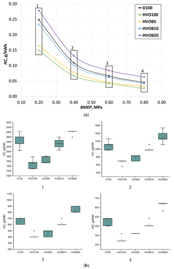 In a compression ignition engine, the air intake system operates with excess air, resulting in unburnt hydrocarbons (HC) and thus low emission concentrations [70]. Figure 17 shows the results of studies of unburnt hydrocarbon (HC) at different engine loads. The obtained results revealed that the concentration of HVO100 is 36–43% lower depending on the engine load compared with conventional diesel. However, having added biobutanol to HVO, HC concentration increased steadily depending on biobutanol concentration. With biobutanol concentration of 5% (HVOB5) it was 28–34%, while adding biobutanol 10% (HVOB10) HC concentration it was 6–8% lower compared with D100. However, increasing the concentration of biobutanol in HVO fuel to 20% resulted in a higher concentration of unburned hydrocarbons than in conventional diesel: 12–39%.