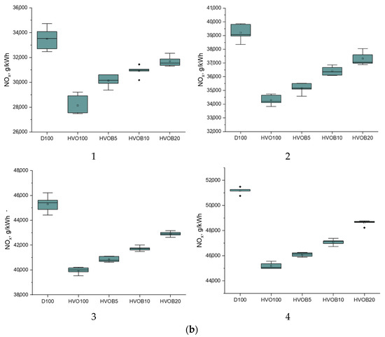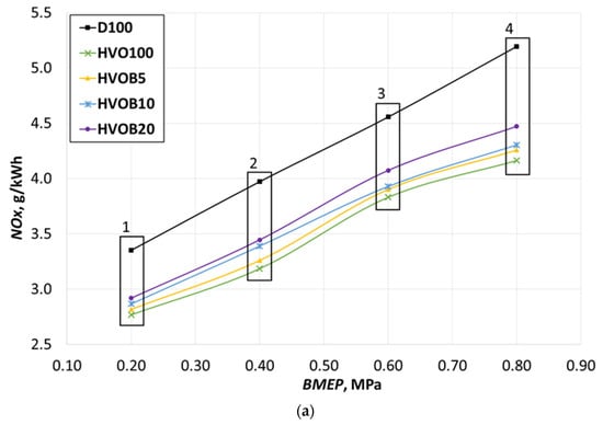 Mixtures of HVO and biobutanol used in the study contain oxygen (Table 2). When increasing the volume of biobutanol, oxygen concentration increases as well. The comparison of NOX emissions in HVO and biobutanol blends with D100 revealed that NOx emissions increased when increasing the biobutanol volume from 5% to 20% in HVO fuels. In HVOB5, NOX emissions decreased by 16–18% compared with D100, in HVOB10 by 14–17%, and in HVOB20 by 13–14%. Addition of oxygen to the fuel also demonstrated conflicting results. Having conducted research with biodiesel and n-butanol (with n-butanol accounting for 30% in the volume of biodiesel), Prabu et al. state that NOX emissions decreased compared with diesels without alcohols. This phenomenon can be justified by a decrease in the combustion temperature [72]. However, results of research conducted by Imdadulas et al. [35] revealed that using oxygen additives, such as n-butanol in biodiesel, rendered an opposite effect, with no reduction in NOX emissions. These conclusions were justified by the fact that alcohols used as an additive in biodiesel reduced the cetane number.