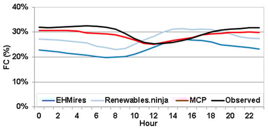 Figure 1 clearly highlights that the MCP approach is the only one capable of following the observed daily profile, preserving one of the most relevant features of wind power generation in Portugal. These results are supported by the hourly correlation data for the different datasets (Table 1).
