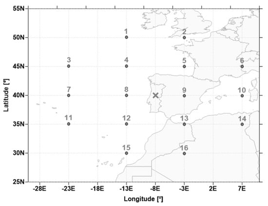 The weather circulation types are identified for each day for a central latitude point. The 16 grid points are equally spaced by 10° and 5° for latitudes and longitudes, respectively, around the central point. For the present study, the central point was chosen in the middle of mainland Portugal, where most wind parks are located, and where data referring to long-term wind capacity were available for the current study.