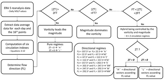 - When FT < |ZT| < 2 FT, the circulation in that specific day is identified as hybrid being controlled by the vorticity and magnitude. In this case, 8 × 2 circulation regimes were considered.