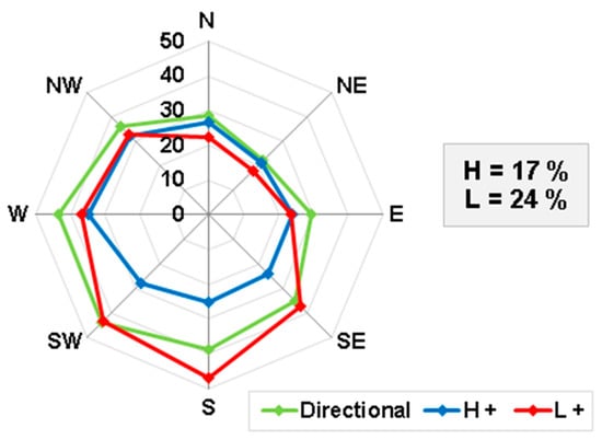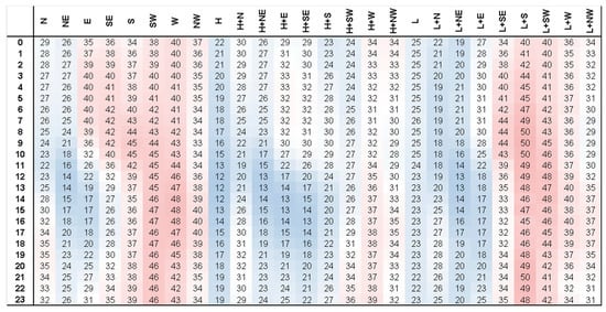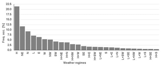 This classification establishes a set of 26 weather circulation types (Table 3). Two of them are classified as pure anticyclonic (H) or low-pressure systems (L), eight of them are defined as directional—according to the wind rose convention—and the remaining 16 are classified as hybrid.