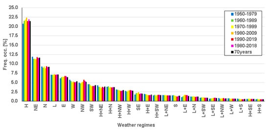 Weather circulation types—frequency of occurrence from 1950 to 2019 (70 years).