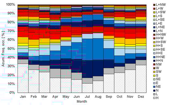 Figure 6 illustrates the accumulated monthly distribution frequency of the weather regimes during the period of 1980–2018. It is visible that the “H” regime was less pronounced in the summer months and the directional sea and land breeze regimes “N” and “NW” increased in this period. The “L” regime remained constant through all the months whereas the “NW” regime notably increased over the spring months. The regimes associated with severe weather (“SW”, “W”, “S”, “L + SW”, and “LW”) tended to be more expressive in the autumn and winter months.